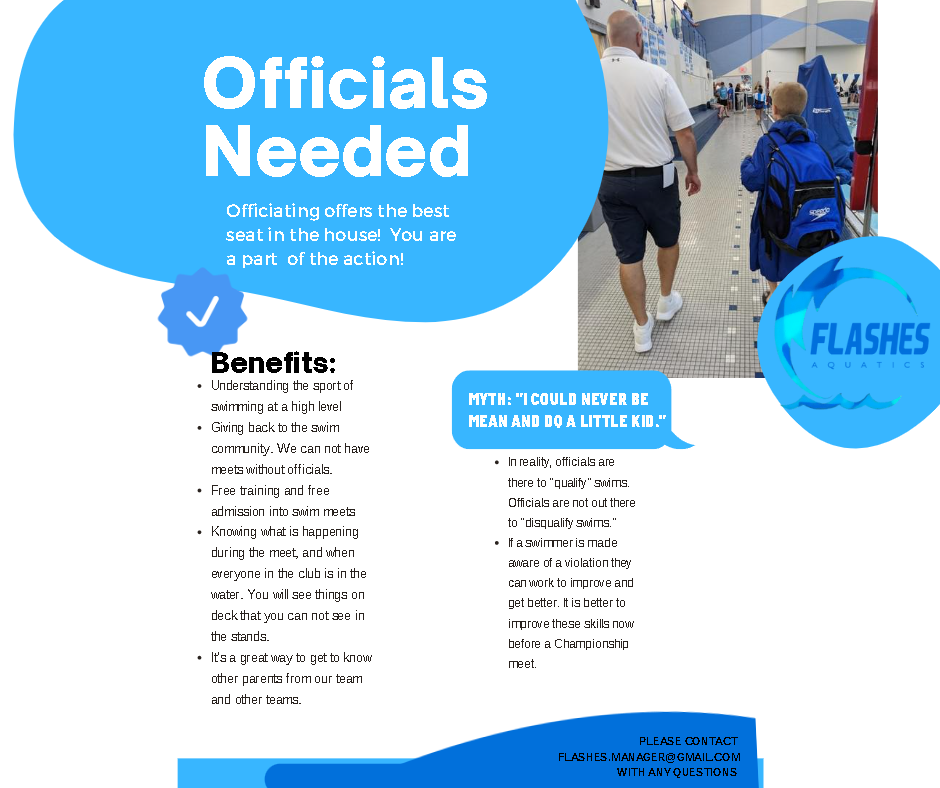 Flashes Aquatics encourages all parents to consider earning certification in a very rewarding and important volunteer position as a USA Swimming Official. There are no pre-requisites in terms of your time on the team, the age and experience level of your swimmer, or prior swimming participation in your younger years. Officiating (and many other volunteer positions) enabled us to fully engage with the team parents and coaches, show interest in our swimmer’s activities, and better understand the challenges and successes our kids they met along the way.